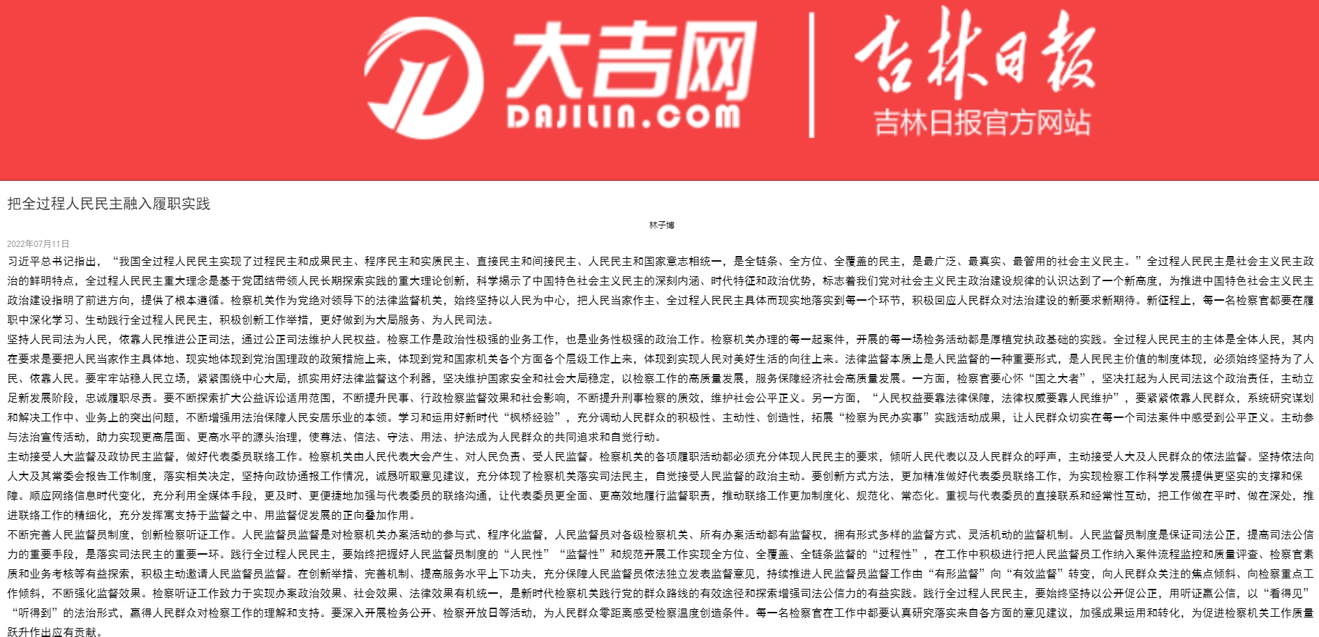 净月区检察院员额检察官林子博发表了《把全过程人民民主融入履职实践》一文,于2022年7月11日在吉林日报纸质版第四版面刊登。