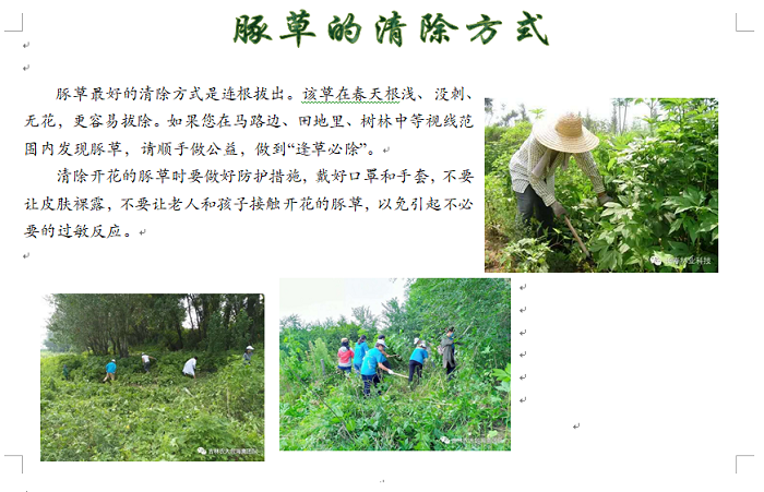 在辖区三公里市场,检察干警和志愿者们积极向过往群众介绍豚草的来历,形态特征和对人体、农作物的危害,并现场发放宣传单和解答群众咨询。随后,一行人来到沿河岸边搜索、拔除豚草,并将植株进行取样,对拔除的植株进行了妥善处理。