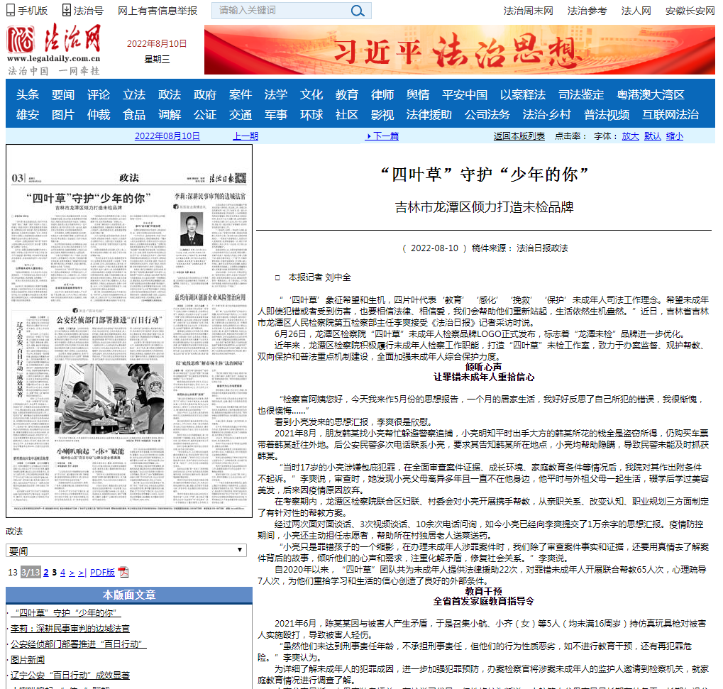 “‘四叶草’象征希望和生机,四片叶代表‘教育’‘感化’‘挽救’‘保护’未成年人司法工作理念。希望未成年人即使犯错或者受到伤害,也要相信法律、相信爱,我们会帮助他们重新站起,生活依然生机盎然。”近日,吉林省吉林市龙潭区人民检察院第五检察部主任李爽接受《法治日报》记者采访时说。