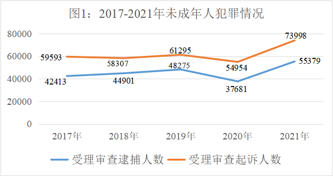 (1)未成年人犯罪数量出现反弹。2017年至2021年,检察机关受理审查逮捕未成年犯罪嫌疑人数分别为42413人、44901人、48275人、37681人、55379人,受理审查起诉未成年犯罪嫌疑人数分别为59593人、58307人、61295人、54954人、73998人。2021年受理审查逮捕、受理审查起诉人数较2017年分别上升30.6%、24.2%。
