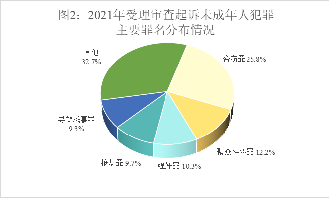 (2)五类主要犯罪占比超三分之二。2021年检察机关受理审查起诉未成年犯罪嫌疑人数居前五位的分别是盗窃罪19061人、聚众斗殴罪9049人、强奸罪7591人、抢劫罪7186人、寻衅滋事罪6902人,分别占受理审查起诉人数的25.8%、12.2%、10.3%、9.7%、9.3%,5类犯罪人数共49789人,占比达67.3%。