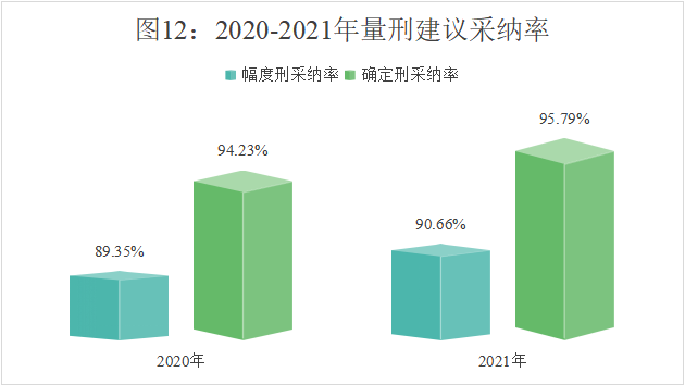 (5)确定刑量刑建议适用率、采纳率高。2021年检察机关针对未成年人犯罪提出量刑建议27874人,其中确定刑量刑建议23635人、幅度刑量刑建议4239人,分别占84.79%、15.21%。量刑建议被采纳26483人,采纳率95.01%,其中确定刑、幅度刑量刑建议分别采纳22640人、3843人,采纳率分别为95.79%和90.66%,分别较2020年增加1.56、1.31个百分点。