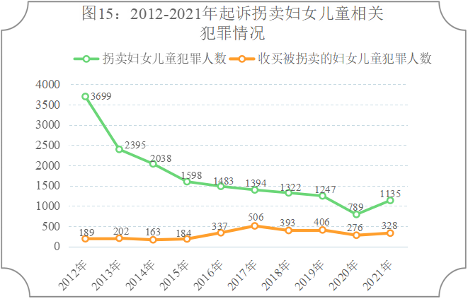 (2)拐卖妇女儿童犯罪呈下降趋势。2012年至2021年,检察机关起诉拐卖妇女儿童犯罪分别为3699人、2395人、2038人、1598人、1483人、1394人、1322人、1247人、789人、1135人,2021年较2012年下降69.32%,年均下降12.3%。同期起诉收买被拐卖的妇女儿童犯罪分别为189人、202人、163人、184人、337人、506人、393人、406人、276人、328人,2021年较2012年上升73.54%,年均上升6.3%。