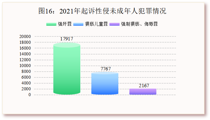 (3)性侵未成年人犯罪增幅趋于平缓。2021年,检察机关起诉强奸未成年人犯罪17917人,同比上升16.61%,增幅为近四年来最低。同期,起诉猥亵儿童犯罪7767人,同比上升32.09%,起诉强制猥亵、侮辱未成年人犯罪2167人。
