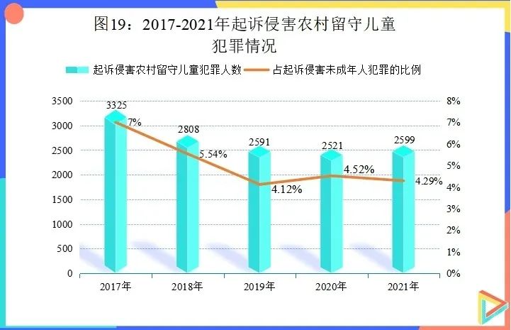 (6)侵害农村留守儿童犯罪总体趋缓。2017年至2021年,检察机关起诉侵害农村留守儿童犯罪人数分别为3325人、2808人、2591、2521人、2599人,分别占侵害未成年人犯罪人数的7%、5.54%、4.12%、4.52%、4.29%。