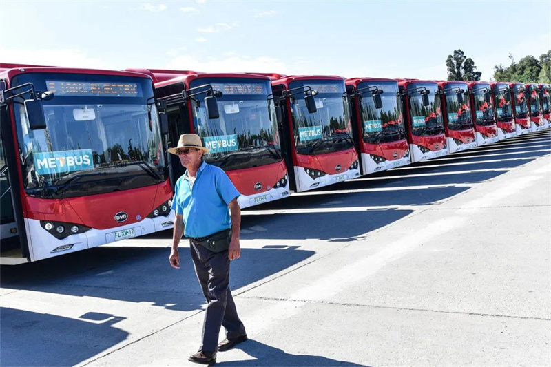 20181213日,在智利首都圣地亚哥的奥伊金斯公园,一名男子从比亚迪电动大巴旁走过。新华社发(豪尔赫·比列加斯摄)