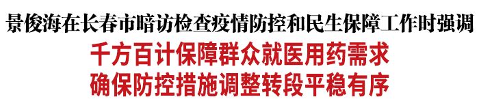景俊海随机来到吉林大药房(大世界店),与工作人员、购药群众深入交流,要求有关部门全力保障药品供应充足和价格稳定,严厉打击制售伪劣药品、囤积哄抬药价等违法行为,确保群众购药用药舒心放心。在吉林大学中日联谊医院,景俊海实地察看发热门诊接诊情况,要求医院持续优化就诊流程,科学调配资源力量,进一步提高服务效率和质量,确保患者及时得到救治。要加强对一线医务人员的关心关爱,既为他们创造良好防护条件,又保障他们合理休息。