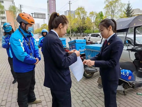 近日,为开展好“十百千万”为民实践活动,更好地为群众办实事,白山市浑江区人民检察院干警走近“饿了么”外卖骑手,为他们讲解相关法律常识,倾听他们的心声。
