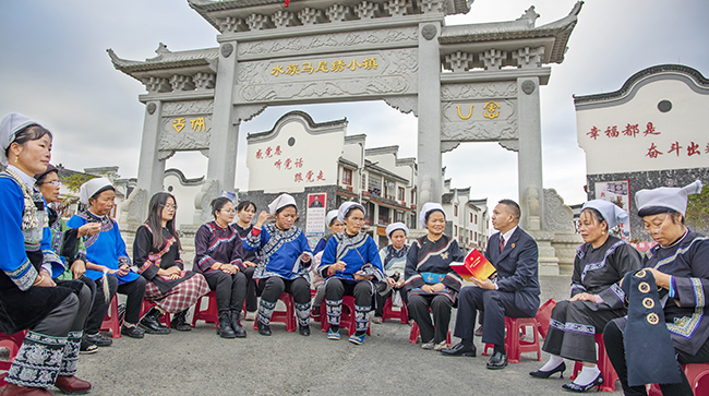 近日,贵州省三都水族自治县检察院“双语”检察干警把党的二十大精神转换成群众语言,深入村寨用“水语+汉语”互译的方式开展宣讲,从群众关注的美丽乡村建设、农业产业发展、医疗保障、农村养老等话题说起,深入解读惠民政策,把党的二十大精神传播到群众心中。 本报通讯员韦毓祥摄