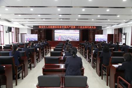 集安市人民检察院组织全体干警在单位集体收听收看党的二十大开幕会盛况,认真聆听习近平总书记代表第十九届中央委员会向大会所作的报告,并认真交流学习。安市
