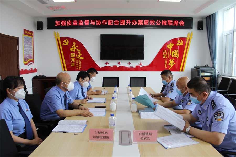 近日,白城铁路运输检察院与白城铁路公安处就“侦查监督与协作配合办公室”成立以来的工作推进情况,召开了联席会议。铁检院分管领导张云华副检察长和第一检察部全体干警、白城铁路公安处分管领导陈岩副处长和法制支队干警,参加了本次会议。