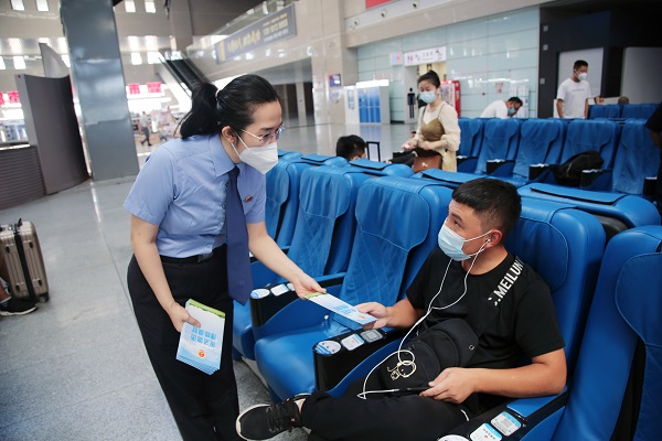 座谈会后,在长春站党委宣传助理李志宇的陪同下,第三检察部干警来到长春站候车室,走到旅客中间,发放宣传册。虽然盛夏时节,长春站候车室凉爽宜人,候车旅客或步履匆匆,或驻足稍事休息,在拿到宣传册后,都认真阅读起来。中午时分,骄阳如火,第三检察部一行人来到长春西站,在长春西站客运主任的陪同下,向候车室等待高铁列车的旅客发放宣传册。