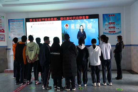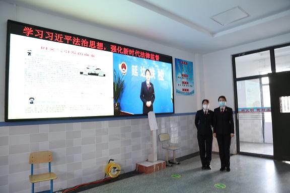 由于疫情原因,为减少人员聚集,将集中上课的法治大讲堂变为屏幕滚动播放的形式。在教学楼一楼大厅最醒目的位置,屏幕上播放着检察官们录制的普法宣传小视频以及挑选出来的与学生们密切相关的案例,并配有与之对应的法条、检察官寄语。用这些真实案例告诉同学们打架斗殴、早恋甚至是吸食毒品所带来的危害。